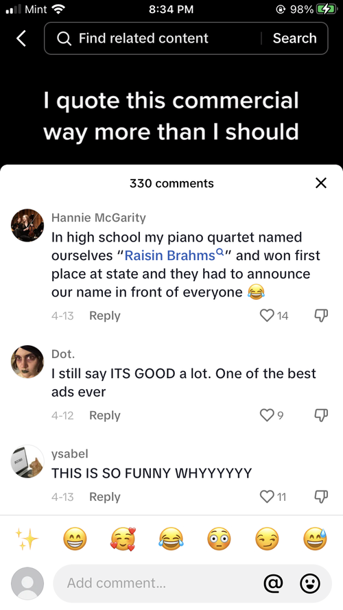 In the face of arts programs being erased from U.S. schools in favor of STEM, this campaign was designed to persuade parents that studying the arts can help students in every facet of their education. Beloved among high school music classes (and reposted by Itzhak Perlman), "Brahms' Breakfast" spawned YouTube parodies, GIFs and has recently found new life on TikTok.